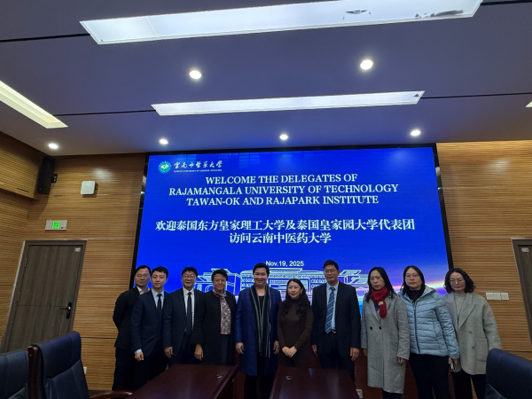 云中讯(对外合作交流处)11月19日,泰国东方皇家理工大学(Rajamangala University of Technology Tawan-Ok)和泰国皇家园大学(Rajapark Institute)代表团一行访问云南中医药大学。副校长俞捷代表学校接待泰方两校代表一行。对外合作交流处、教务处、护理学院相关人员参加了工作会谈。泰方两所高校此次来访,旨在进一步深化与我校在传统医药及相关专业领域的交流合作,推动中泰教育资源共享与多层次国际合作。