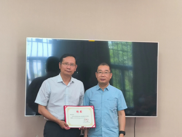 2023年5月,张荣平(左)当选学校第六届学术委员会主任委员,校长丁中涛为其颁发聘书