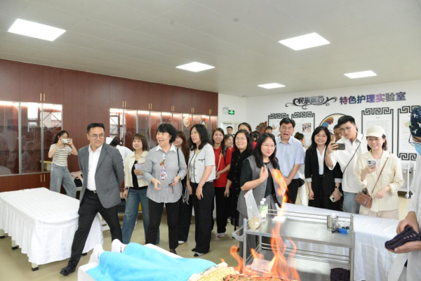 座谈交流结束后,代表团一行前往护理教学实验中心进行参观,工作人员向代表团成员详细介绍了教学实验中心的建设情况、智慧教学的特色以及中医护理、民族医护理特色疗法的开展情况。双方还就开展学生互派、教学、临床及科研合作等具体事宜进行了现场交流。