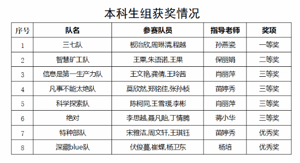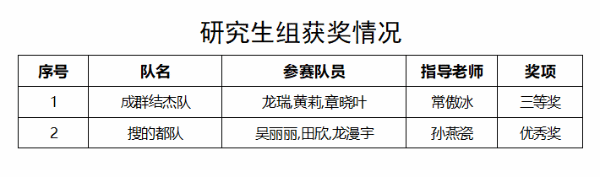 根据省赛评审规则,我校共斩获本科生组一等奖1项,二等奖1项,三等奖4项,优秀奖2项;研究生组获三等奖1项,优秀奖1项。同时,我校荣获本次大赛“优秀组织奖”,常傲冰、保丽娟、苗婷秀老师被评为“优秀组织工作者”,孙燕瓷老师被评为“优秀指导教师”。具体获奖名单如下:
