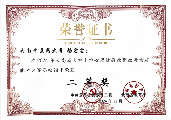 云中讯(学工部)11月1日,由中共云南省委教育工委、云南省教育厅主办的2024年云南省大中小学心理健康教育教师素质能力大赛在昆明冶金高等专科学校举行。我校心理健康教育与服务中心专职教师杨雯雯荣获高校组二等奖。