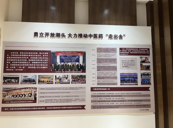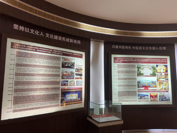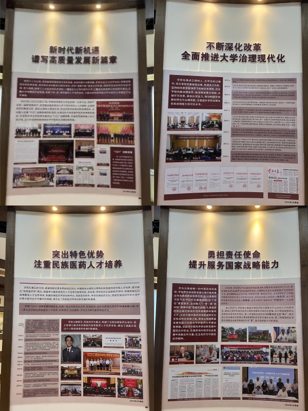 更新后的校史馆2馆按先总后分的思路进行内容布局。内环4块展板分别从推动学校高质量发展整体思路布局、深化体制机制改革进程、民族医药特色优势、服务地方经济社会发展成效四个方面进行梳理呈现。外环17块展板分别从铿锵足音、党建引领、立德树人和高校五大职能八个方面进行系统梳理展示。铿锵足音版块以时间轴的方式,图片化展示了1960年创立以来学校发展史上具有里程碑意义的事件;党建引领版块集纳式呈现了2010年以来学校两届党委领导班子推进全面从严治党情况;立德树人版块梳理了2010年以来学校思政教育发展脉络和开展德育教育的举措成效;人才培养版块梳理呈现了2010年以来学校深化教育教学改革、提升人才培养质量的脉络,梳理了学校历次制定的本科人才培养方案,集纳呈现了2010年以来我校获得国家级荣誉的部分教师和人才;科技创新版块梳理呈现了学校实施创新驱动发展战略的思路举措和取得的标志性科技成果;服务社会版块从突发疫情时冲锋在前、脱贫攻坚中扎根奉献、志愿服务中绽放光芒三个视角对我校师生发挥资源人才优势、服务社会需求进行了撷英呈现;文化传承创新版块梳理了学校加强校园文化建设的脉络和突显中医药文化特色丰富文化育人内涵的举措经验;对外交流合作版块对我校开展中医药国际化教育、促进中医药对外交流合作的历史脉络和发展成就进行了梳理呈现。