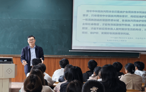 云中讯(统战部)10月11日下午,校党委书记邱勇以“铸牢中华民族共同体意识”为主题,为2024级生物制药班、2024级护理7班的学生讲授了一堂生动鲜活、内涵深刻的专题思政课。