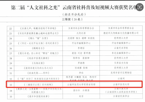 云中讯(新闻与融媒体中心)近日,云南省社会科学界联合会公布第二届“人文社科之光”云南省社科普及短视频大赛获奖名单。我校创作的科普作品《微眼识云药》荣获三等奖。