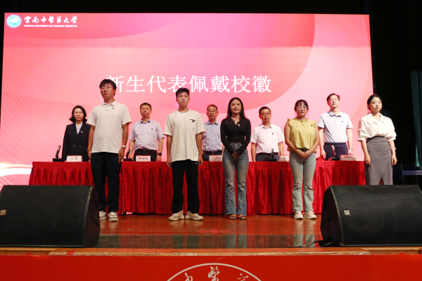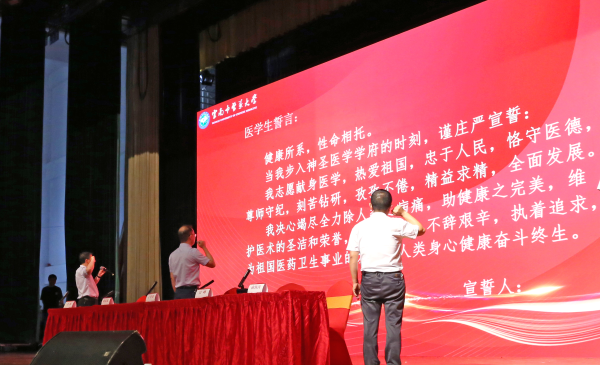 陈祖琨带领全体2024级新生进行医学生集体宣誓,主席台的领导为新生代表佩戴校徽。