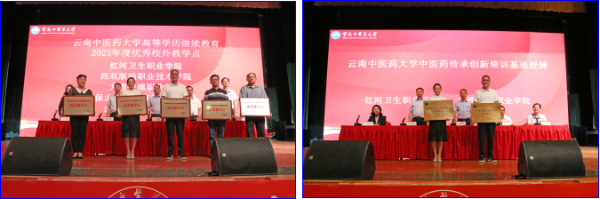 典礼上还对我校高等学历继续教育2023年度优秀校外教学点和优秀管理人员进行表彰,对我校新增的“云南中医药大学中医药传承创新培训基地”进行授牌。