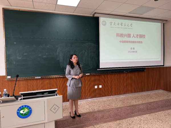 俞捷围绕“党的二十大对教育、科技、人才统筹部署的创新及深义”,“开辟发展新领域新赛道塑造云南发展新动能新优势”和“云中学子的使命与担当”三个主题开展授课。她对党的二十大报告中提出的“实施科教兴国战略,强化现代化建设人才支撑”的内涵作了详细解读,强调科教兴国、人才强国、创新驱动发展都离不开人才,人才的培养离不开学校。对中共云南省委关于深入学习贯彻党的二十大精神,强化科技创新,实施教育强省战略、人才强省战略,奋力开创新时代云南社会主义现代化建设新局面的部署进行作详细解读。俞捷指出,民族医药传承与创新是服务“民族团结进步示范区”的重要举措,中药绿色生产是服务“生态文明建设排头兵”的重要举措,开展传统医药交流是服务“建设面向南亚、东南亚辐射中心”的重要举措。她强调,发挥中医药多元价值,助力云南高质量跨越式发展是云中人义不容辞的责任和使命。