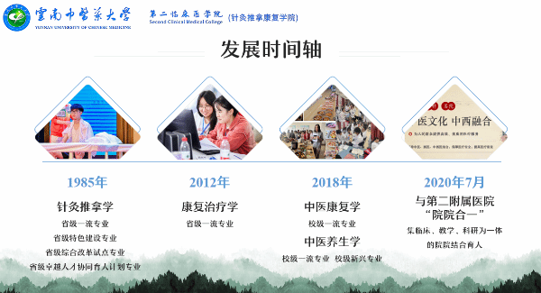 学院承办针灸推拿学、康复治疗学、中医康复学和中医养生学四个本科专业。针灸推拿学专业1985年开始招生,为云南省省级一流专业、云南省省级特色建设专业、云南省省级综合改革试点专业、云南省省级卓越人才协同育人计划专业;康复治疗学专业2012年开始招生,为云南省省级一流专业;中医康复学和中医养生学专业2018年开始招生,为校级一流专业。推拿学为国家“十二五”中医药重点学科,针灸学为云南省省级重点学科。针灸推拿学专业2000年获批硕士学位授权点,2018年获批博士学位授权点;中西医结合康复学专业2015年获批硕士学位授权点。现有编制床位405张,设置职能科室20个、临床医技科室24个、本科教研室8个、临床教研室6个及1个针灸推拿康复研究所;有国家级项目中心2个(国家级“防治卒中中心”、国家级“高血压达标中心”);国家中医优势专科1个(重症医学科);国家中西医协同“旗舰”科室云南省推荐项目科室4个(脑病科、老年病科、重症医学科、康复医学科);省级中医特色专科4个(针灸科、推拿科、内分泌科、妇产科);云南省中西医协同重点科室2个(老年病科、重症医学科);省级中医区域诊疗中心2个(脑病科、康复医学科);云南省中医临床重点学科2个(中医康复学、中西医结合脑病学)、云南省高校重点实验室1个(云南省高校针灸推拿防治脑病重点实验室)、云南省兴滇英才支持计划创新团队1个、云南省高校创新团队1个(云南省高校针灸防治神志病创新团队);同时是云南省中医(康复)示范基地、云南省中医康复专科联盟牵头单位、心源性卒中防治基地;云南省神经内科专科联盟理事单位;中医脑健康与认知障碍防治试点建设单位。