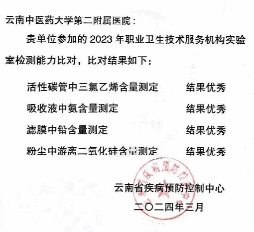 云中讯(第二附属医院)近日,云南省疾病预防控制中心召开的2024年职业卫生技术服务机构质量控制工作会通报,医院职卫中心在2023年全省职业卫生技术服务机构实验室能力比对考核中取得“四项优秀”的优异成绩,综合评定为优秀等次。