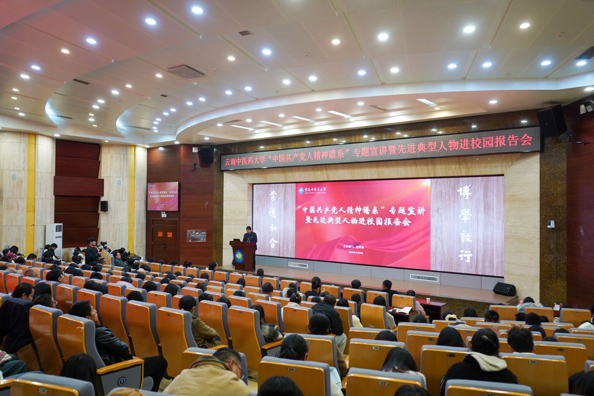 云中讯(新闻与融媒体中心)12月5日下午,云南中医药大学在呈贡校区举行“中国共产党人精神谱系”专题宣讲暨先进典型人物进校园报告会,邀请残奥会世界冠军、全国自强模范、中国青年五四奖章获得者王家超,“全国岗位学雷锋标兵”“中国青年优秀志愿者”、昆明市延安医院学生党总支书记唐维伟两位青年党员分享他们的励志故事和奉献人生。活动旨在响应教育部等七部门发出的全国高校“立报国强国大志向 做挺膺担当奋斗者”宣传教育号召,通过身边优秀青年共产党员的典型示范,教育引导广大云中学子在学思践悟中国共产党人精神谱系中追寻信仰之源、坚定理想信念、厚植家国情怀、勇担历史使命,努力成长为担当民族复兴大任的时代新人。