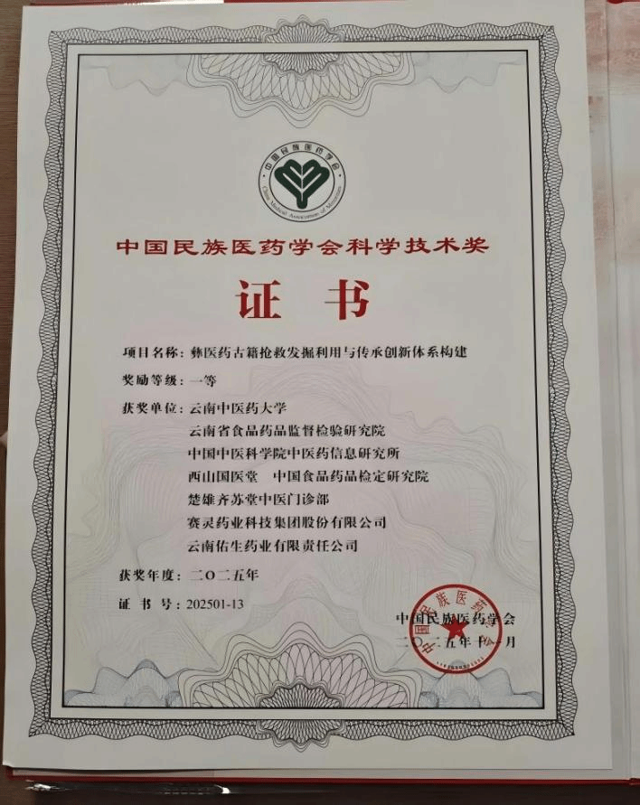 罗艳秋教授牵头的《彝医药古籍抢救发掘利用与传承创新体系构建》获中国民族医药学会科学技术奖一等奖。该成果在彝医药研究方面实现6个关键技术突破:①实现原生性与再生性保护模式对古籍资源系统集成;②首次构建彝医生命时空理论体系;③构建结构化彝医名词术语体系与病症分类体系;④构建彝医药文化遗产活态传承理论与技术体系;⑤对彝医生命时空医学(气浊二元)流派临床经验系统总结与产业开发;⑥构建基于“人用经验-医学理论-科学实验”的彝药创制与二次开发路径;形成彝医药标准的研究范式,形成“质量评价到标准研制”创新路径,成为民族医药标准研究、对照物质研制的最佳样板。研发3个新药并产业化,发布4个制剂国家标准和7个国家标准物质,获14项授权专利,发布3项团体标准,3项决策咨询报告被云南省人民政府及行业部门采用,9项研究报告得到国家级研究成果引用。发表论文70篇,出版著作14部。该成果获奖不仅是对学校在彝医药传承创新领域系统性、原创性研究成果高度认可,更彰显了学校在彝医药学科建设与产业赋能中的关键地位。