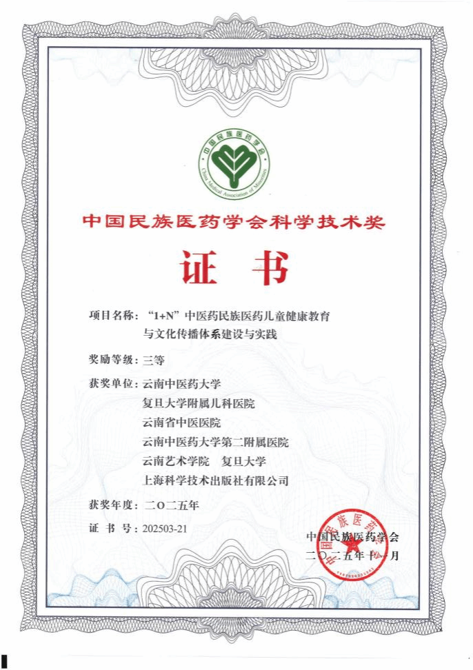 熊磊教授牵头的《‘1+N’儿童中医药民族医药健康教育与文化传播体系建设与实践》获中国民族医药学会科学技术奖三等奖。该成果围绕中医药民族医药科普在儿童群体中存在内容晦涩难懂、表现形式单一、参与度和认知度低等不足的研究难题,首次将中医药民族医药文化融入家庭阅读与儿童健康教育场景,以《亲子共读:中医文化启蒙绘本》“1” 为核心,融合文创产品、平台、特色活动等“N”元素,打造“读、识、唱、练、用”五感协同的中医启蒙模式,搭建起家长及儿童了解运用中医药民族医药的窗口与桥梁,对坚定文化自信、守护全民健康有重要的社会意义。