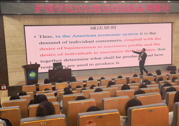 云中讯(通讯员 王瑞欣)11月14日,护理学院在翰墨楼一楼报告厅开展2025级新生英语四级备考辅导。学院特邀外语部副主任黄兴亚老师主讲,全体2025级本科学生参加辅导。