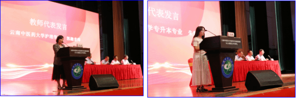 护理学院教师郭趣、2024级康复治疗学专业专升本同学朱青美分别作为教师和新生代表进行表态发言。