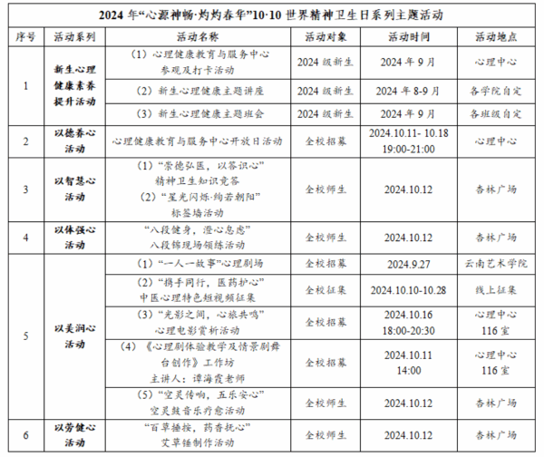 云中讯(学工部)为进一步发挥心理健康教育育人功效,学工部心理健康教育与服务中心(以下简称中心)于9月至10月举办了2024年“心源神畅·灼灼春华”世界精神卫生日系列主题活动。