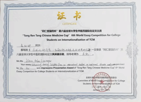 云中讯(通讯员 张舒乔)2025年1月12日,在国家中医药管理局的大力支持下,由世界针灸学会联合会秘书处与上海中医药大学中医药国际化发展研究中心联合举办的“同仁堂国药杯”第六届全球大学生中医药国际化征文决赛在深圳顺利举办。