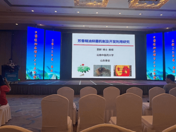 董鲜教授在病害防治分会场作主持并作报告,题目为“芳香精油抑菌机制及开发利用研究”