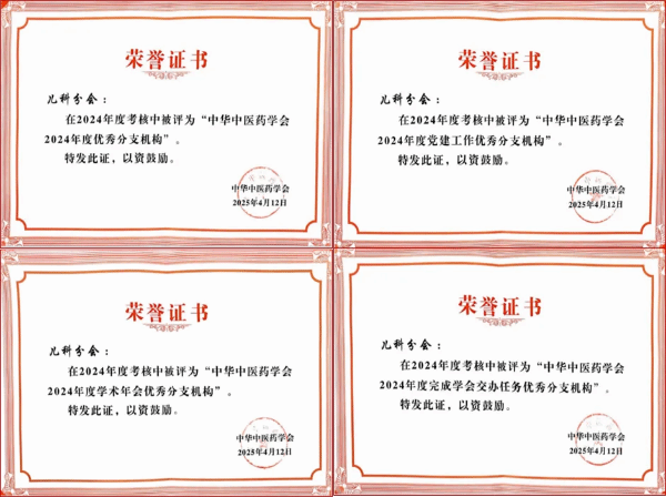 云中讯(第一附属医院)中华中医药学会2025年分支机构工作会议4月11日至12日在北京召开。会议总结了中华中医药学会2024年主要工作,部署了2025年工作任务,并为2024年度考核优秀等次分支机构颁发荣誉证书。我校熊磊教授担任主委的儿科分会荣获“2024年度优秀分支机构”“2024年度党建工作优秀分支机构”“2024年度学术年会优秀分支机构”“2024年度完成学会交办任务优秀分支机构”四项荣誉。
