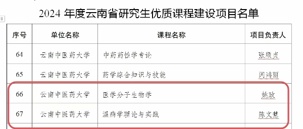云中讯(基础医学院)12月24日,云南省学位委员会和省教育厅公布了2024 年度云南省研究生优质课程建设项目立项结果,经组织申报、形式审查、专家评审后,我院姚政和陈文慧两位教授分别牵头申报的《医学分子生物学》《温病学理论与实践》两门课程获得立项建设。