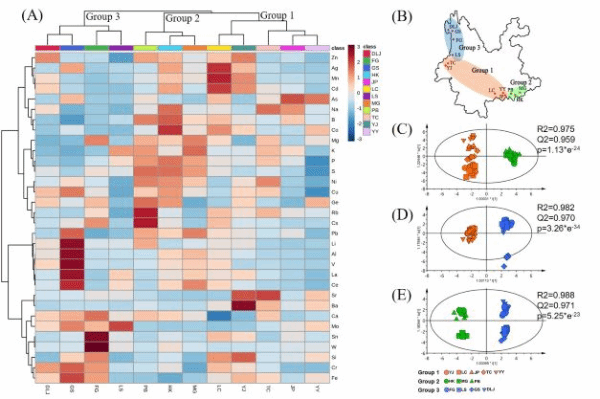 A. 基于32种元素的HCA分析 B. 样品的地理信息 C-E: 两组之间OPLD-DA图