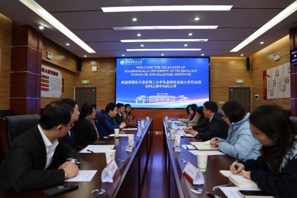 云中讯(对外合作交流处)11月19日,泰国东方皇家理工大学(Rajamangala University of Technology Tawan-Ok)和泰国皇家园大学(Rajapark Institute)代表团一行访问云南中医药大学。副校长俞捷代表学校接待泰方两校代表一行。对外合作交流处、教务处、护理学院相关人员参加了工作会谈。泰方两所高校此次来访,旨在进一步深化与我校在传统医药及相关专业领域的交流合作,推动中泰教育资源共享与多层次国际合作。