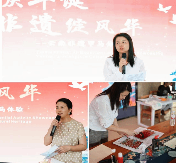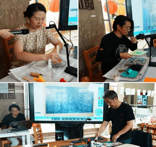 紧接着,一场关于非遗拓印技艺与“甲马”版画的别开生面的讲解吸引了众人目光,老师们分别介绍了木刻甲马拓印工具与胶刻版画所使用的工具、拓印步骤、技巧,并详细进行了现场演示。