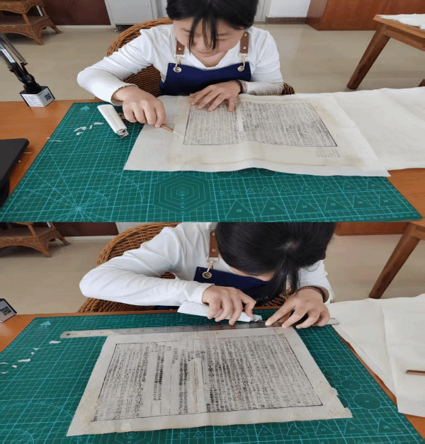 “对症下药”根据纸张材质、厚度及颜色配纸,用镊子、毛笔、糨糊,喷壶等称手工具进行“施针用药”,修补虫洞、黏合裂痕。其所遵循的“整旧如旧”原则与中医文化不谋而合。