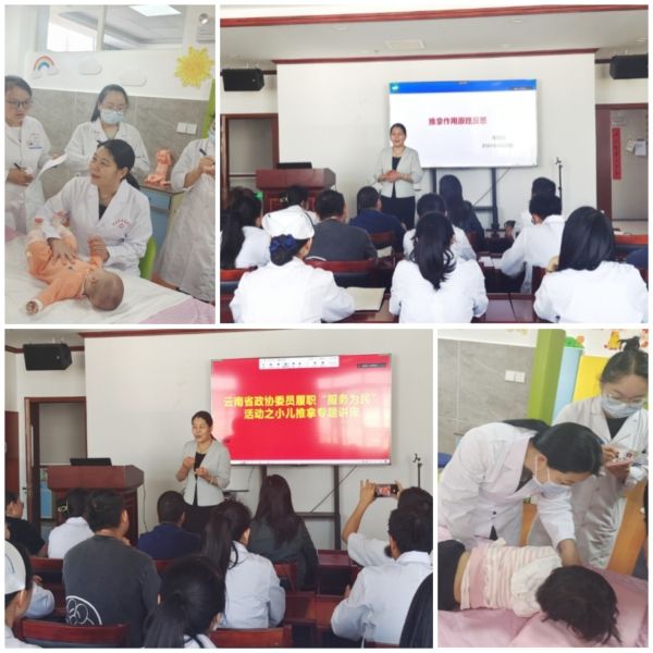在保山市中医医院,邰先桃教授团队开展义诊活动并举办小儿推拿专题讲座,重点引导医务人员对中医推拿作用原理进行讨论,分析如何处理中医推拿“道”与“术”的关系,助力健康中国发展等问题。