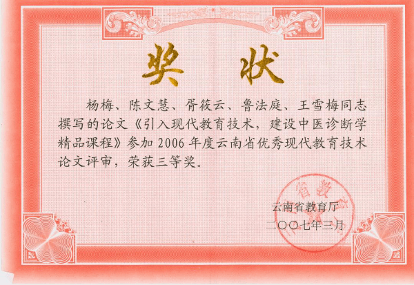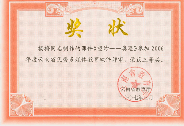 伴随着互联网信息技术发展的脚步,杨梅老师教授的中医诊断学成为学校最早开展多媒体教学的课程,并因此获得多个奖项。