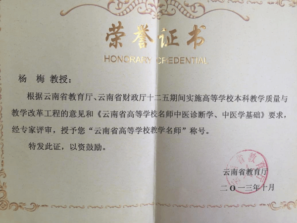 岁月漫流,鲜花和掌声化作杨梅身上一个个闪亮的勋章:2009年荣获伍达观教育基金杰出奖;2012年、2014年获荣红云园丁优秀奖;2013年获云南省教学名师称号,课题“傣医学高等教育人才培养体系建设的研究和实践”获云南省第七届高等教育教学成果一等奖;2014年建立“杨梅名师工作室”。