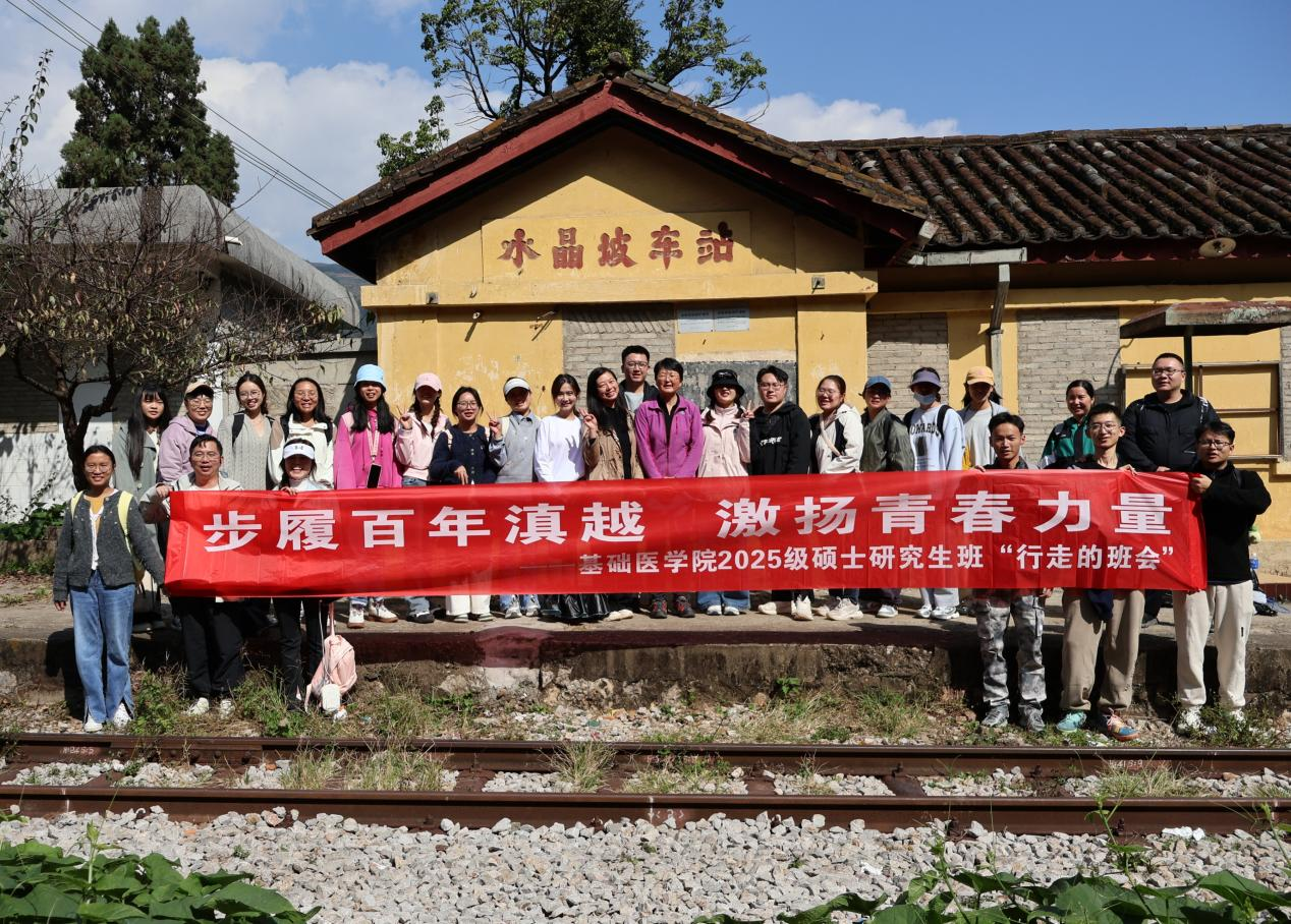 云中讯(基础医学院)11月17日,基础医学院2025级硕士研究生班开展了一场别开生面的“行走的班会”主题实践活动。同学们走出校园,踏上滇越铁路可保村至水晶坡段,以脚步丈量历史,以心灵对话百年,在行走中感悟民族精神,在实践中激扬青春力量。
